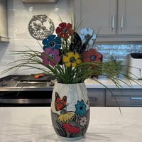 *To clarify - "These flowers are made from recycled metal" - such as wheelbarrows, tool boxes, carts, tool chests, and ironing boards. We hand-cut recycled items to make each flower a unique, lovely, and whimsical masterpiece. We strive for 100% satisfaction.