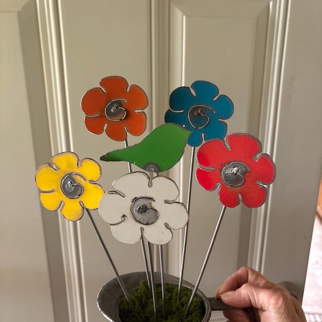 Handmade by Parker K. These beautiful, whimsical, and rustic flowers are made from recycled metal. They will brighten up your table, flower bed, or anywhere else in your home. They're also perfect for indoor and outdoor plantings.